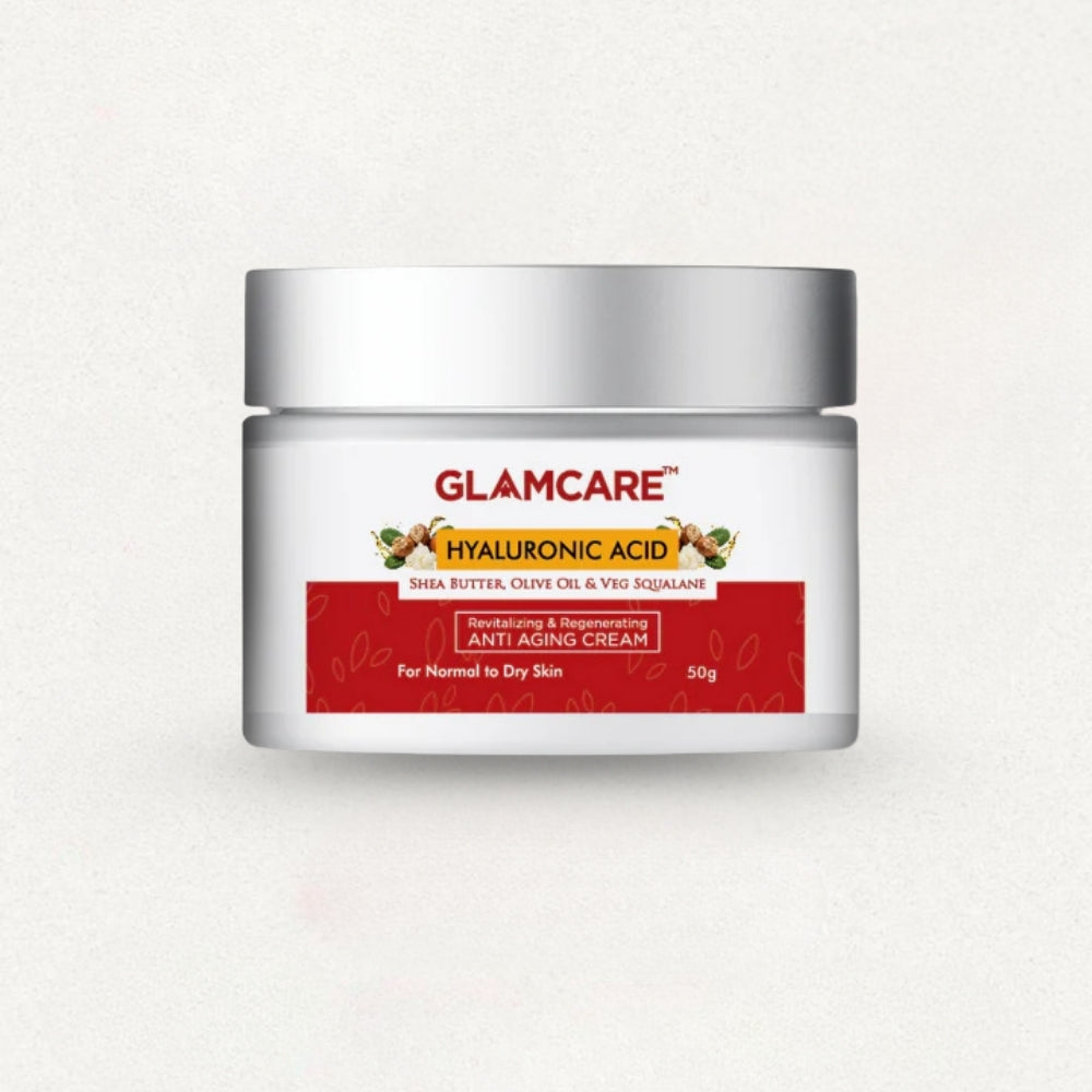 Unit price perTurn back the clock on your complexion with Glamcare Anti-Aging Cream- 50 g, a rich, regenerating formula driven by Hyaluronic Acid, Shea Butter, Olive Oil, and Squalene. Formulated to address visible signs of aging, this hyaluronic acid anti-aging cream provides intense hydration, enhanced elasticity, and a radiant glow — making it a vital component of your skincare regimen.