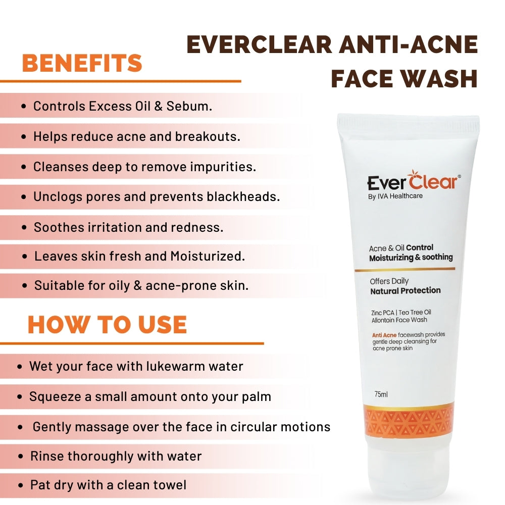 - Everclear Anti-Acne Face Wash – Deep cleanses, removes dirt, oil, and impurities while fighting acne-causing bacteria.