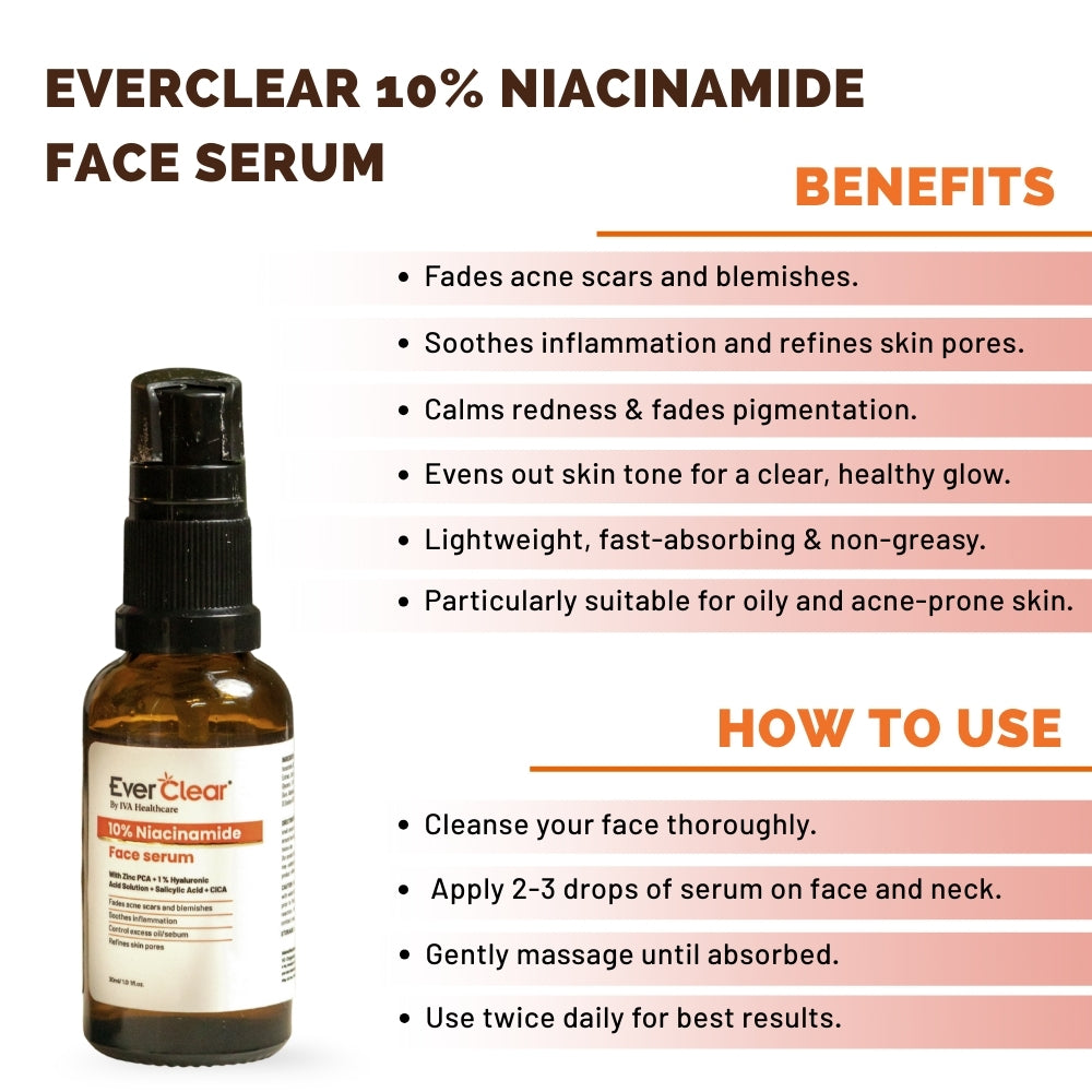 - Everclear 10% Niacinamide Face Serum – Controls oil, reduces acne marks, minimizes pores, and strengthens the skin barrier.